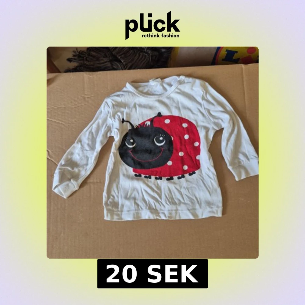 Söt vit långärmad tröja från H&M med stor nyckelpiga framtill i rött, svart och vitt. Tröjan är i mjuk bomull och har rund hals. Perfekt för små barn som gillar färgglada tryck och lekfulla motiv. (Fläckar kan gå bort med vanish i tvätten)