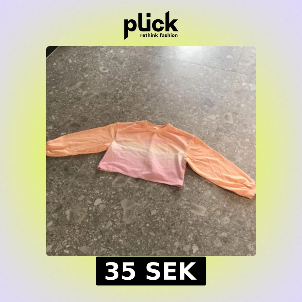 Säljer en croppad sweatshirt från H&M i pastellfärger med texten 'FRIDAY FEELING' på bröstet. Tröjan har långa ärmar och en mjuk bomullskänsla. Färgerna går i en gradient från persika till ljusrosa.