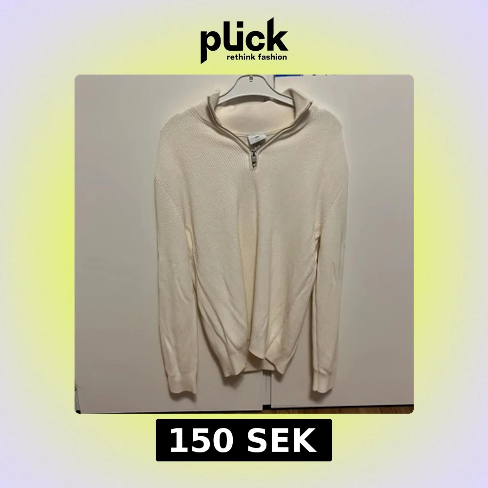 Vit stickad tröja från H&M med half zip-dragkedja och hög krage. Slim fit-modell med ribbade detaljer på axlar och ärmslut. Perfekt för lager-på-lager och snygg till både jeans och chinos.