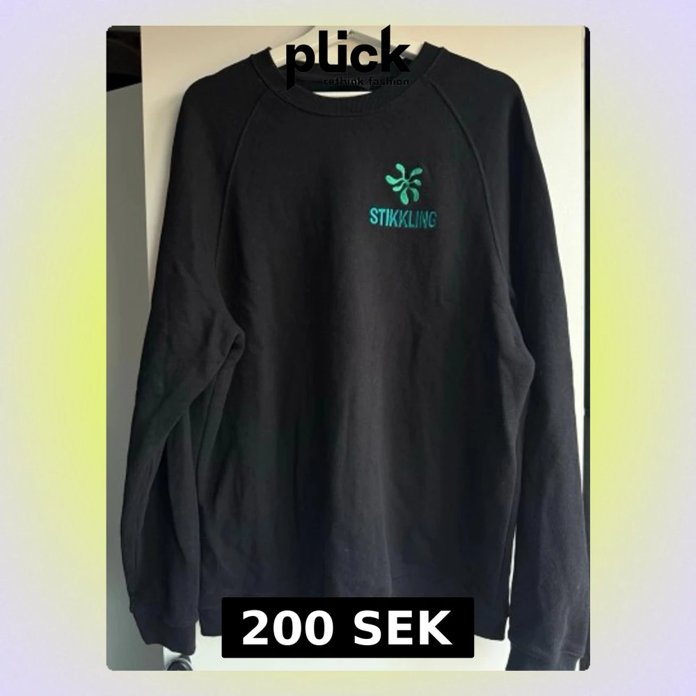 Svart sweatshirt från H&M i regular fit med grön broderad STIKKLING-text och växtmotiv på bröstet. Klassisk rund halsringning och långa ärmar. Perfekt för dig som gillar enkel men snygg stil.