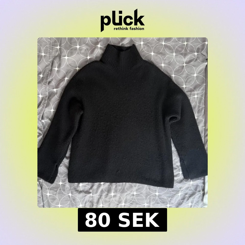Säljer en stilren svart stickad polotröja med hög krage. Tröjan har långa ärmar och en lös passform med diskret slitt i vardera ärm. Passar bra till både jeans och kjol. Org pris 250kr Strlk L men passar S