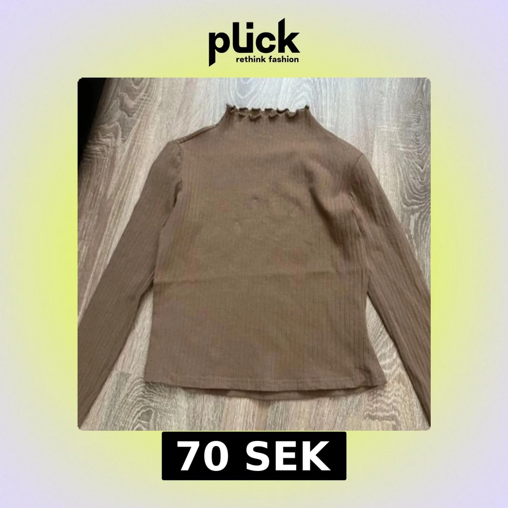 Säljer en beige ribbad långärmad topp med volangkant vid halsringningen. Toppen har en smal passform och är tillverkad i ett mjukt, stretchigt material. Perfekt att styla med jeans eller kjol.