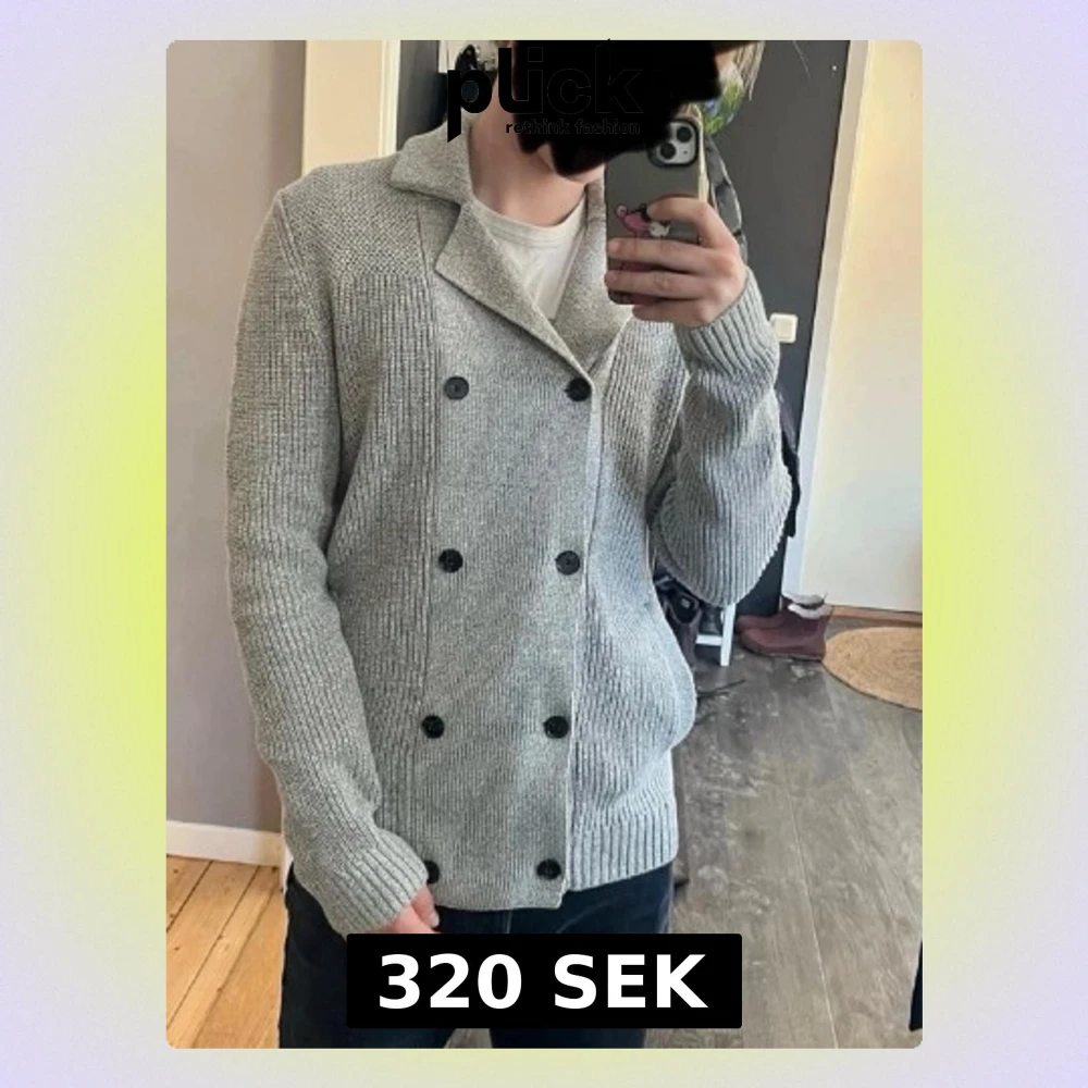 Säljer en ljusgrå stickad kofta med dubbelknäppning och krage. Koftan har svarta knappar i två rader och är ribbstickad för en snygg struktur. Mycket bra skick, inga defekter! Passar dig som är mellan 175-182cm ungefär.Skriv för mer information!🤝