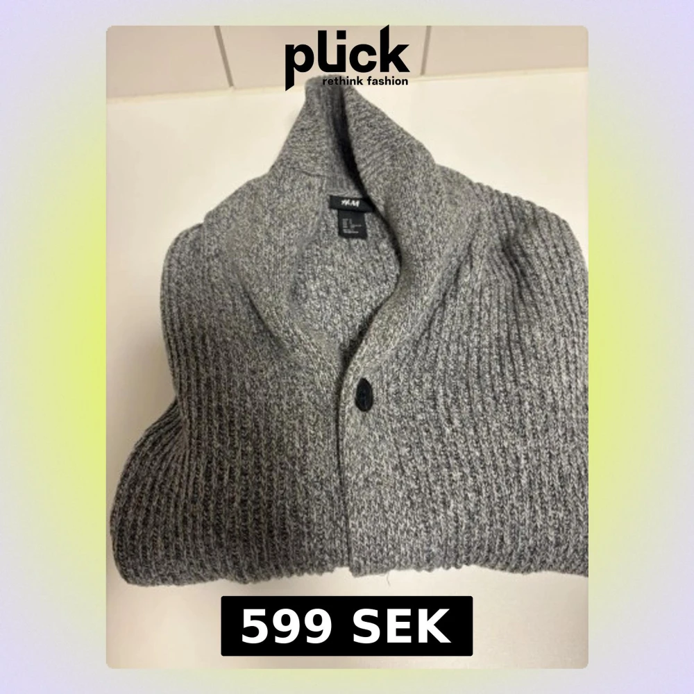Snygg grå stickad kofta från H&M med grov ribbstickning, stora svarta knappar och två fickor framtill. Koftan har en hög krage och långa ärmar, perfekt för lager-på-lager-stil under kyliga dagar.