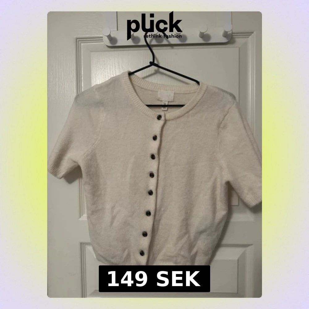 Kortärmad vit kofta från H&M i mjukt stickat material. Rund halsringning och svarta/mörkbruna knappar framtill. Perfekt att slänga över ett linne!😽💋