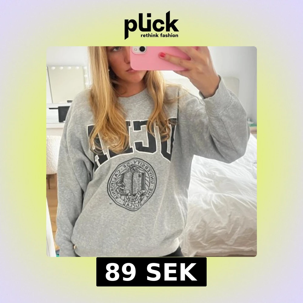 Säljer en grå sweatshirt från UCLA med stort tryck framtill och klassiskt universitetsmärke. Tröjan har rund hals, långa ärmar och en oversized passform. Perfekt för en chill och sportig look.