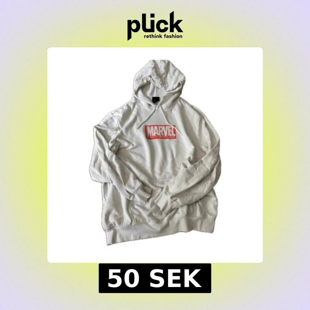 Säljer en vit hoodie från H&M i samarbete med Marvel. Tröjan har en stor röd Marvel-logga på bröstet, huva med snörning och känguruficka framtill.
