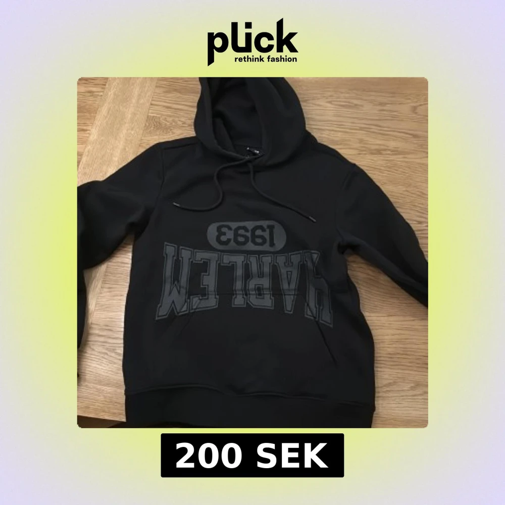 Säljer en svart hoodie från H&M med trycket 'HARLEM 1993' på framsidan. Tröjan har en klassisk design med huva och dragsko. Perfekt för en avslappnad stil.