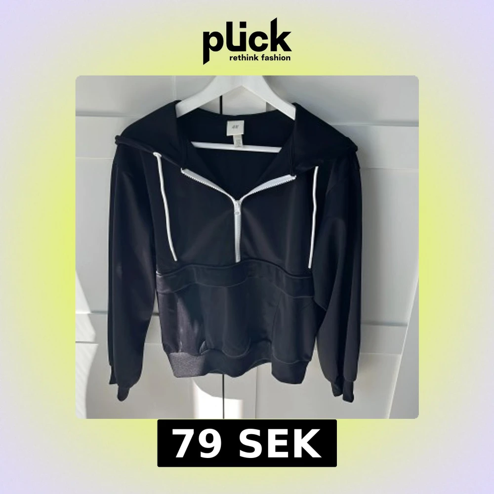 Svart hoodie från H&M med vit half zip-dragkedja och vita snören i huvan. Tröjan har en stor ficka framtill med dragkedja och är tillverkad i ett slätt, syntetiskt material. Långärmad och med ribbade muddar för en clean look.
