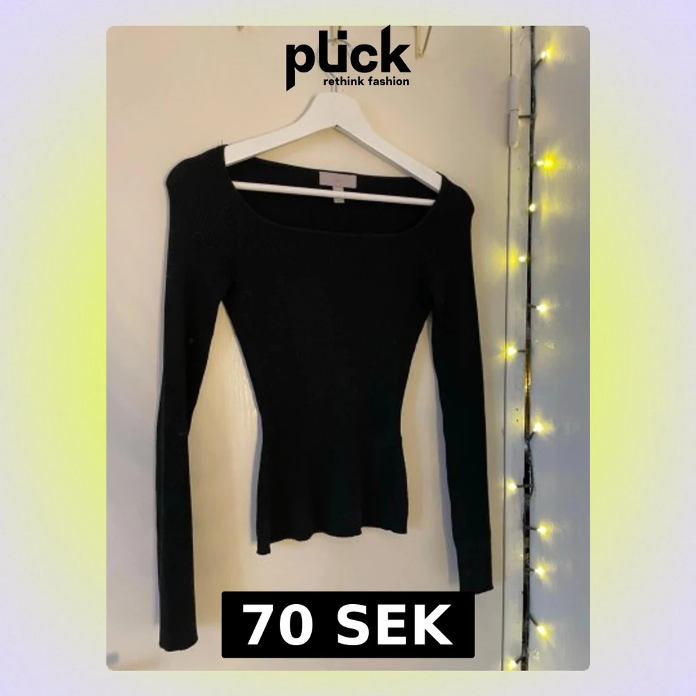 Säljer en svart, ribbad långärmad tröja från H&M i storlek XS. Tröjan har en snygg, fyrkantig urringning och sitter tight mot kroppen🤩