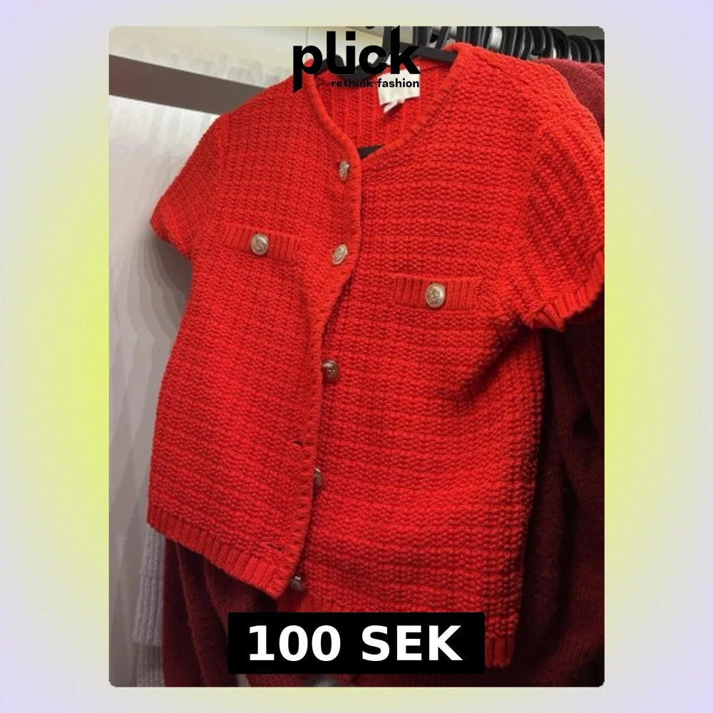 Trendig röd stickad kofta från H&M med korta ärmar och dekorativa guldfärgade knappar framtill. Två fejkfickor med knappdetaljer på bröstet. Grovstickad struktur och ribbade kanter ger en cool retrovibe.