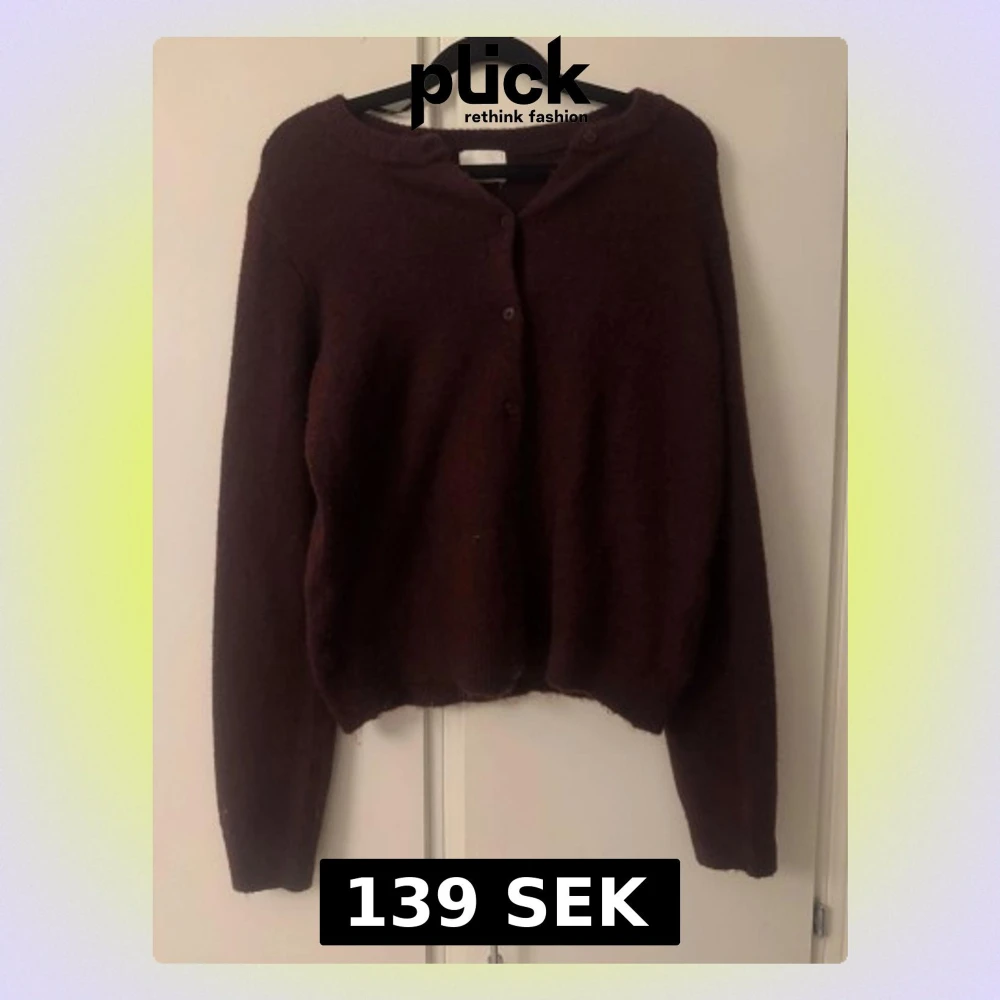 Säljer en mysig mörk vinröd stickad kofta med rund hals och knappar framtill. Koftan har långa ärmar och en lite croppad passform som ger en cool vibe. Perfekt att slänga över en t-shirt eller linne när det är kyligt ute.