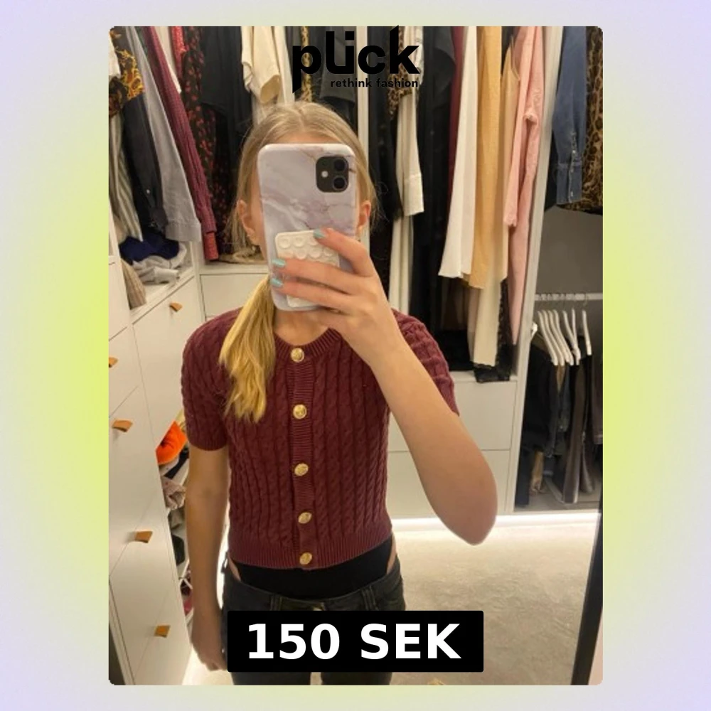 Kortärmad vinröd kabelstickad kofta med snygga guldknappar framtill. Modellen är croppad och har ribbad kant nedtill. Perfekt att styla över ett linne eller t-shirt för en trendig look.