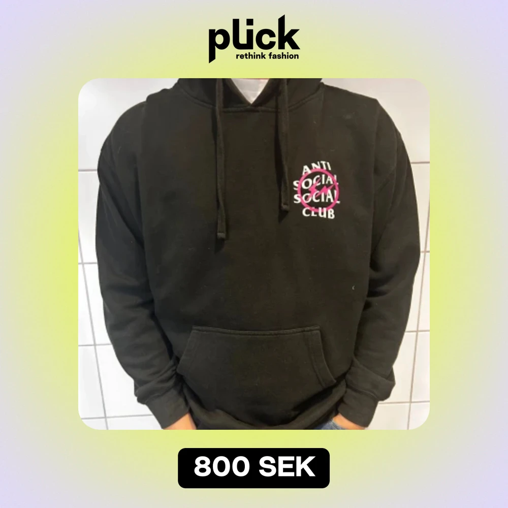 Säljer en svart hoodie från Anti Social Social Club. Den har en stor logga i vitt och rosa både fram och bak. Perfekt för en avslappnad stil och att hålla sig varm. Den har en klassisk känguruficka och justerbar huva med snören.