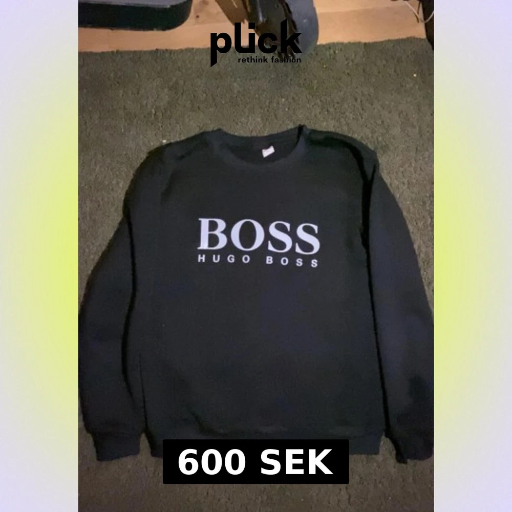Svart sweatshirt från Hugo Boss med stor vit BOSS-logga på bröstet. Tröjan har rund hals, långa ärmar och en klassisk, enkel design utan extra detaljer. Perfekt för dig som gillar stilrena och snygga märkesplagg. Är M men närmare S