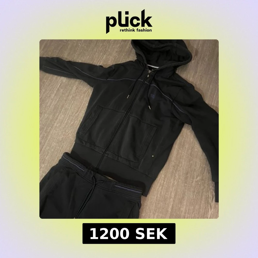 Mörkblå tracksuit från Hugo Boss med dragkedja, huva och snörning. Tröjan har diskreta blå detaljer längs sömmarna och två stora fickor framtill. Tillverkad i mjuk bomullsmix, perfekt för chill dagar. Boss-logga broderad på bröstet. Och baksida byxorna