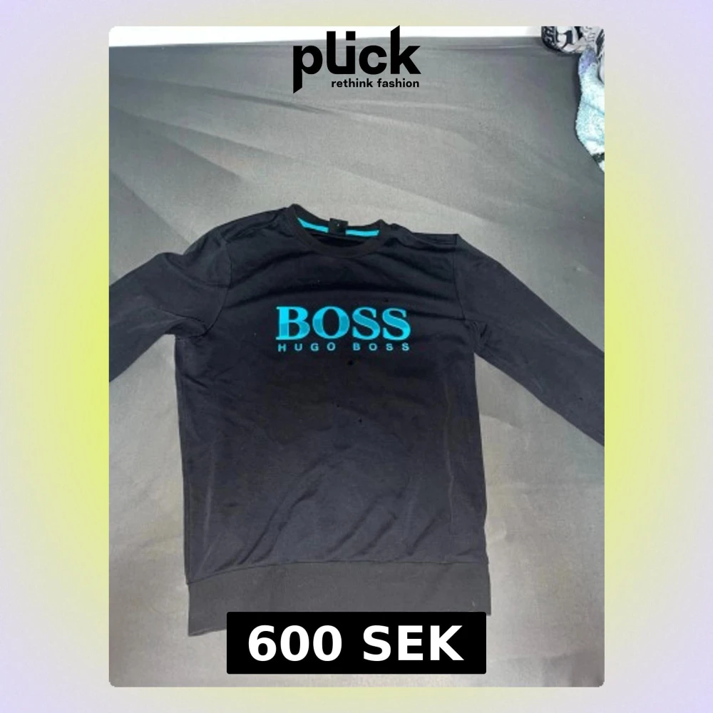 Svart sweatshirt från Hugo Boss med turkost tryck på bröstet där det står 'BOSS HUGO BOSS'. Tröjan har rund halsringning och ribbade muddar vid ärmslut och nederkant. Perfekt för en clean och stilren look.