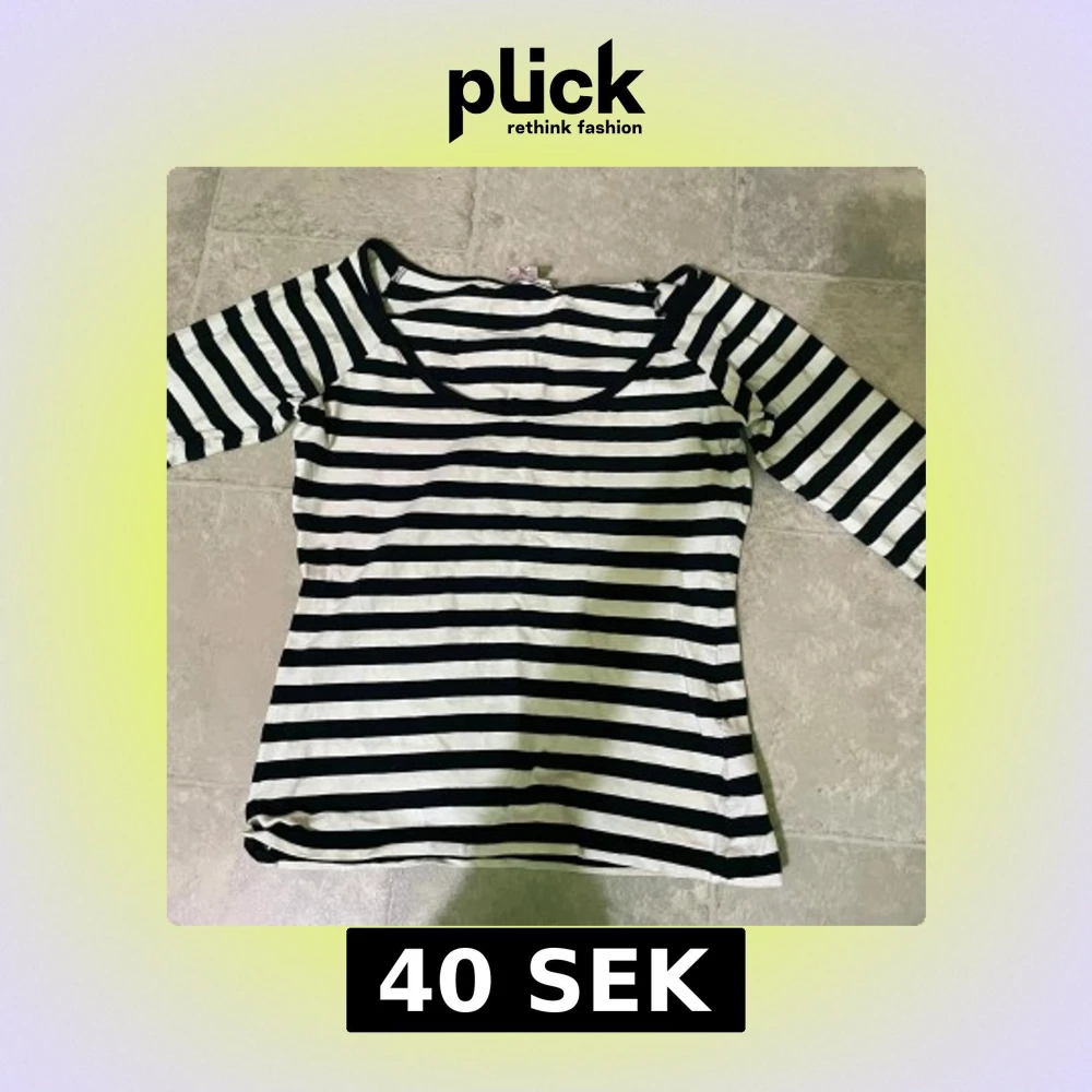 Säljer en svartvit randig topp med trekvartsärm och rund halsringning. Perfekt för en stilren och klassisk look. Tunn och mjuk i materialet, passar bra till jeans eller kjol.