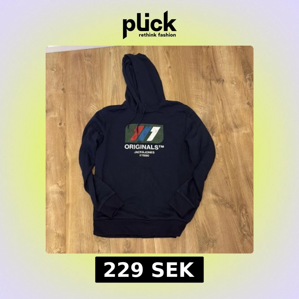 Snygg mörkblå hoodie från Jack & Jones Originals med tryck i rött, blått, vitt och grönt framtill. Tröjan har huva med snörning och långa ärmar. Perfekt för chill dagar och streetstyle. Materialet känns som mjuk bomull och passformen är normal.