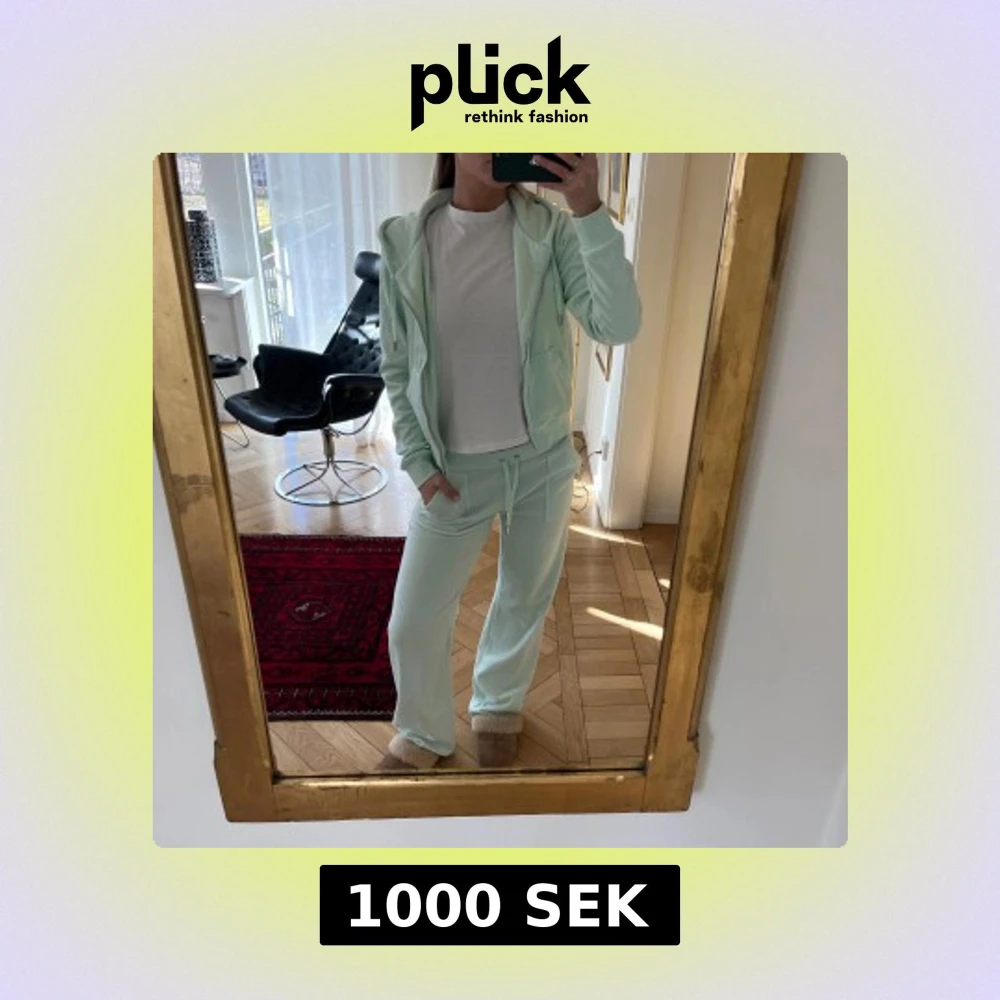 Juicy Couture set i en så fin mintgrön färg. Materialet är lite annorlunda från det vanliga materialet. Dragkedjan på koftan är trasig så går inte att stänga.