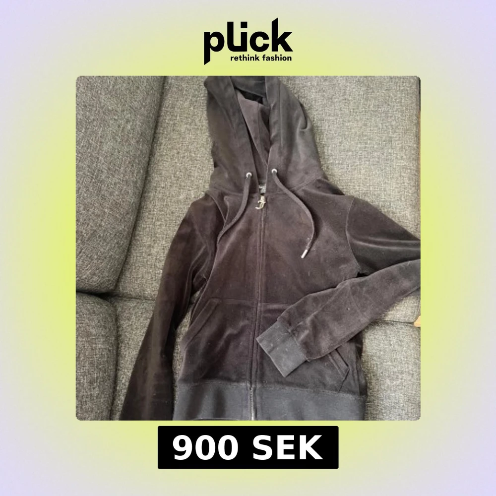 Säljer en svart juicy kofta med dragkedja och huva. Tröjan har långa ärmar och är tillverkad i ett mjukt material. Koftan är svart men färgen ser ut som den gör på bilden pga ljuset. Själva ”J” på dragkedjan är lite rostig.
