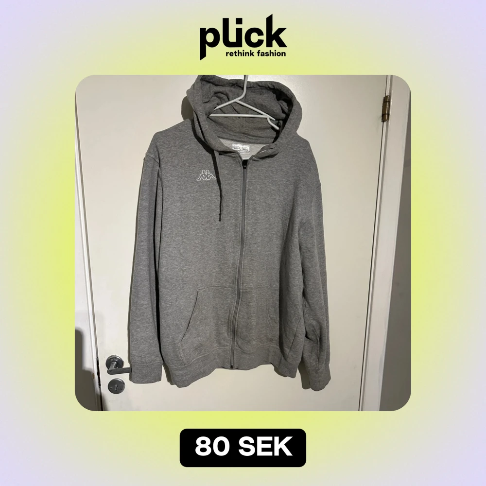 Säljer en grå hoodie från Kappa i bra skick. Den har en dragkedja framtill och en klassisk känguruficka. Perfekt för höst och vår, med en bekväm passform och långa ärmar. Huvan har dragsko för justering. Perfekt för en avslappnad stil!