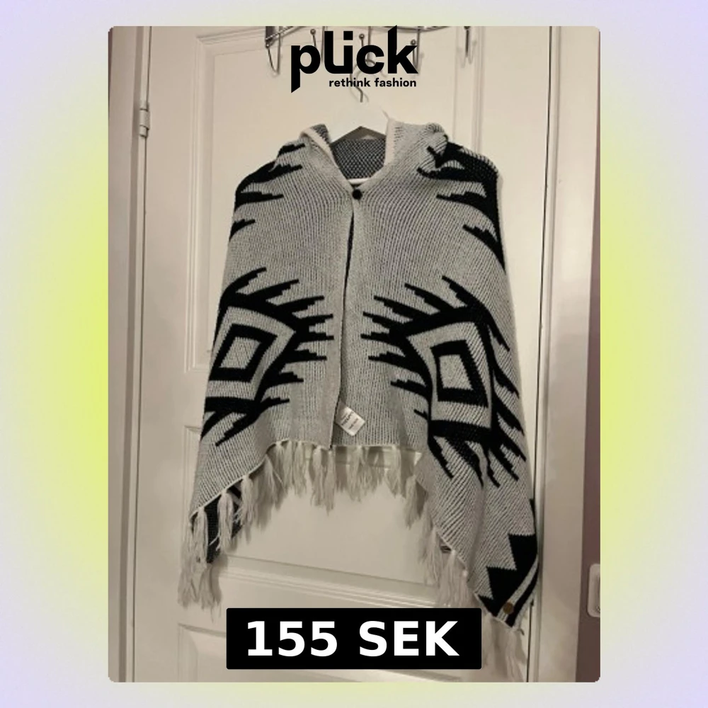 Snygg stickad poncho från KappAhl i grått och svart med grafiskt mönster. Ponchon har huva, fransar längs nederkanten och knäppning framtill.