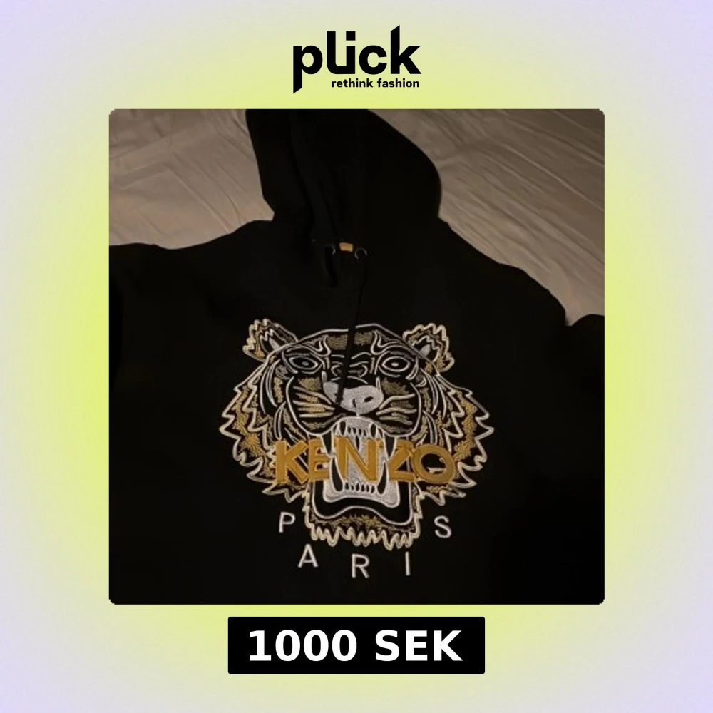 Svart hoodie från Kenzo med ikonisk tigerbrodyr i guld och vitt på bröstet samt texten 'KENZO PARIS'. Tröjan har huva med snörning och är tillverkad i 100% bomull. Är äkta kan leta fram kvitto.