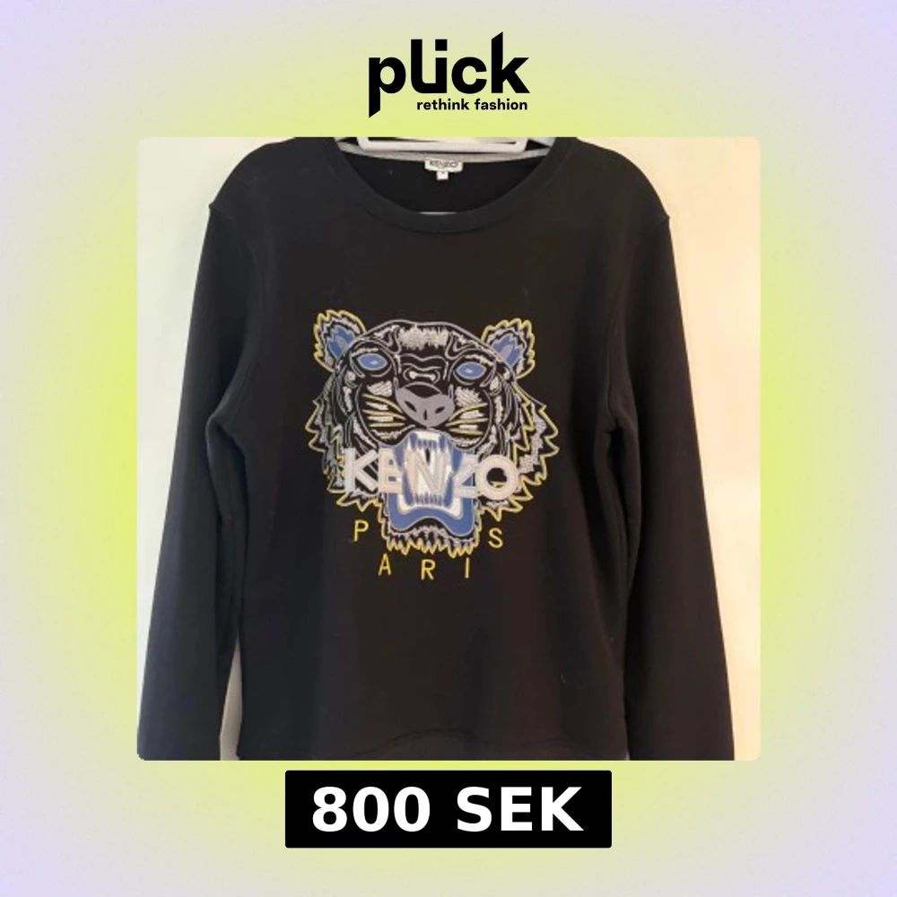 Svart sweatshirt från Kenzo med ikonisk tigerbrodyr i blått, guld och vitt framtill. Klassisk rund halsringning och långa ärmar. Stort broderat Kenzo Paris-tryck på bröstet. Perfekt statement-plagg för dig som gillar streetstyle. Storlek M. Använd men fortfarande i väldigt bra skick.