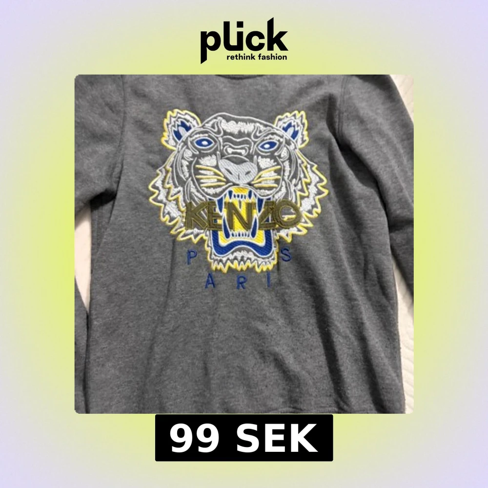 Säljer en grå sweatshirt från Kenzo med ikoniskt broderat tigerhuvud i blått, gult och vitt. Tröjan har rund halsringning och långa ärmar. Perfekt statement-plagg för dig som gillar streetstyle och vill sticka ut.