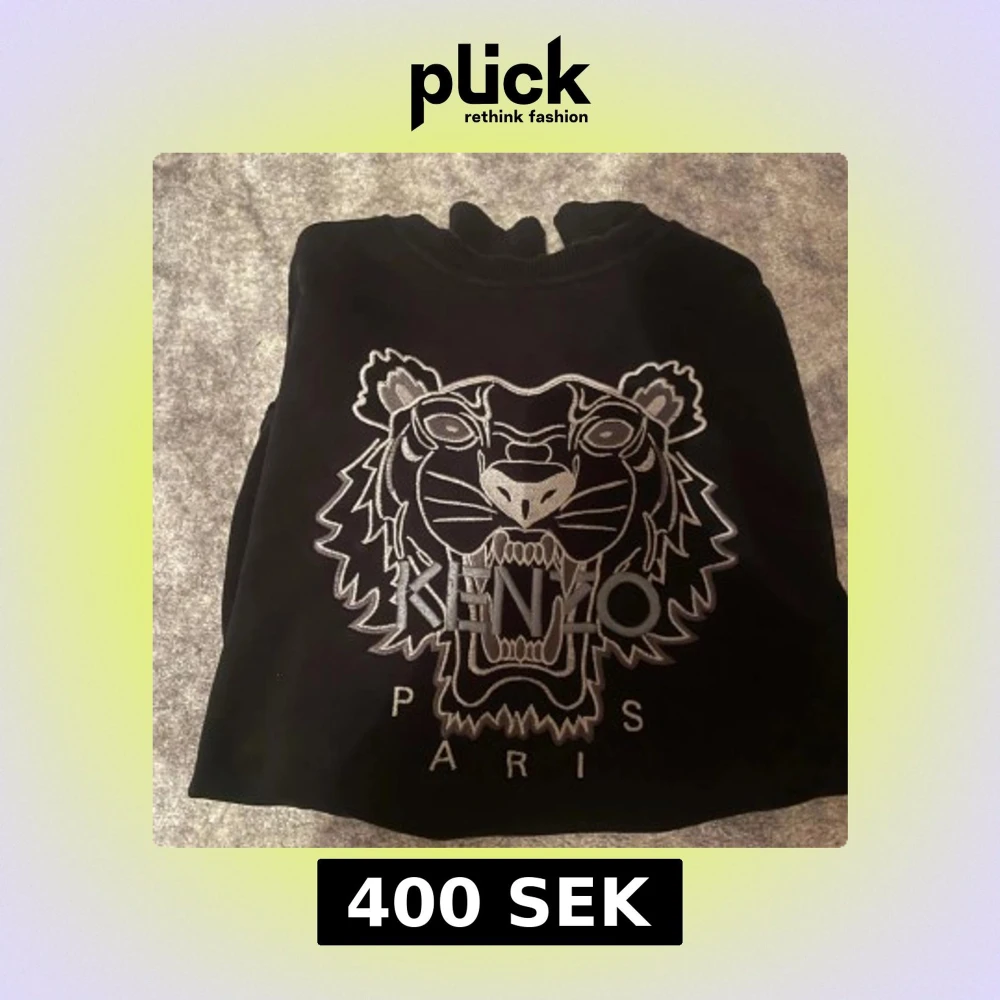 Säljer en svart sweatshirt från Kenzo med ett stort broderat tigerhuvud och texten 'Kenzo Paris' på framsidan. Tröjan har långa ärmar och ribbade muddar vid ärmslut och nederkant. Perfekt för en stilren look.
