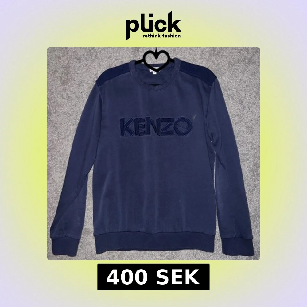 Säljer en mörkblå sweatshirt från Kenzo med stor broderad logga på bröstet. Tröjan har rund halsringning, ribbade muddar och axelpartier i matchande tyg. Perfekt för dig som gillar stilrena och trendiga plagg. Storlek M men sitter som S