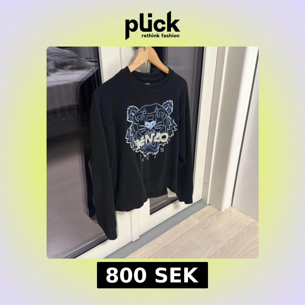 Svart sweatshirt från Kenzo i storlek S med ikonisk broderad tiger i blå och vita toner på bröstet. Tröjan har rund hals, ribbade muddar och är långärmad. Perfekt för dig som gillar statement-plagg och coola designer.