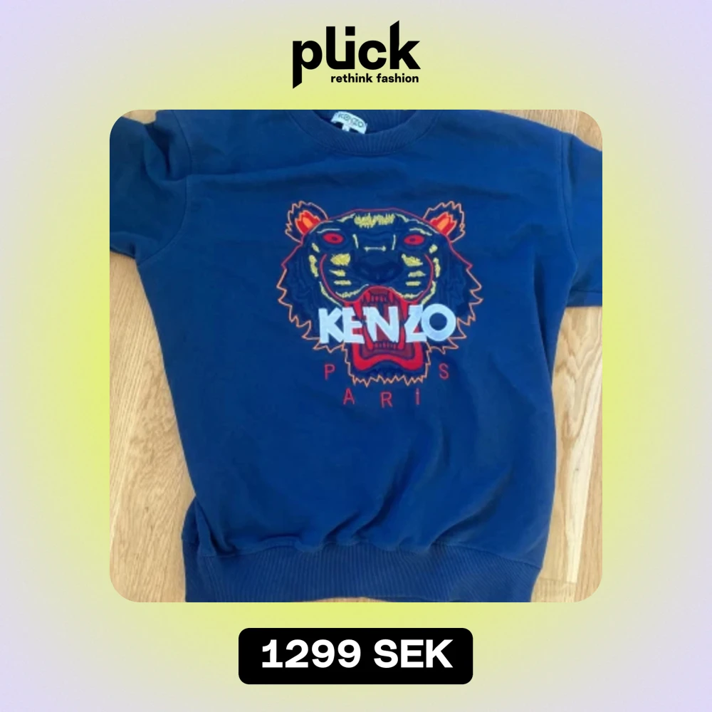 Säljer en snygg blå tröja från Kenzo med ett coolt tigertryck i gult, rött och vitt på framsidan. Tröjan har korta ärmar och är perfekt för en avslappnad stil. Passar både till vardags och fest!