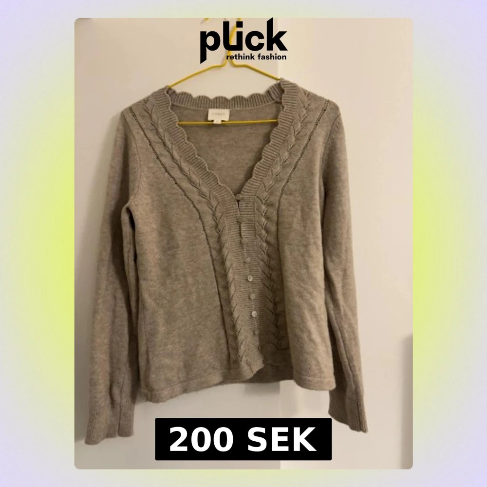 Super söt finstickad beige kofta med detaljer längst v-rigningen. Den fjärde knappen är halv, men det är inget som syns och den fungerar fortfarande som vanligt. Kolla sista bilden för färgen. Öppen för prisförslag!