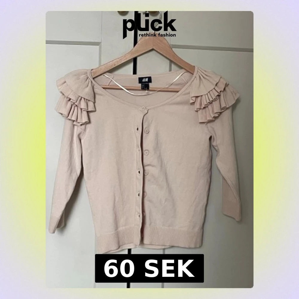 Supersöt ljusbeige kofta från H&M med knappar framtill och unika volangdetaljer på axlarna. Koftan har trekvartsärmar och ribbade muddar. Perfekt för dig som vill ha något gulligt och trendigt i garderoben.