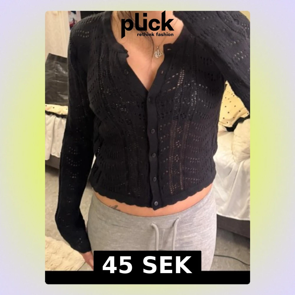 Snygg svart virkad kofta med långa ärmar och knappar framtill.