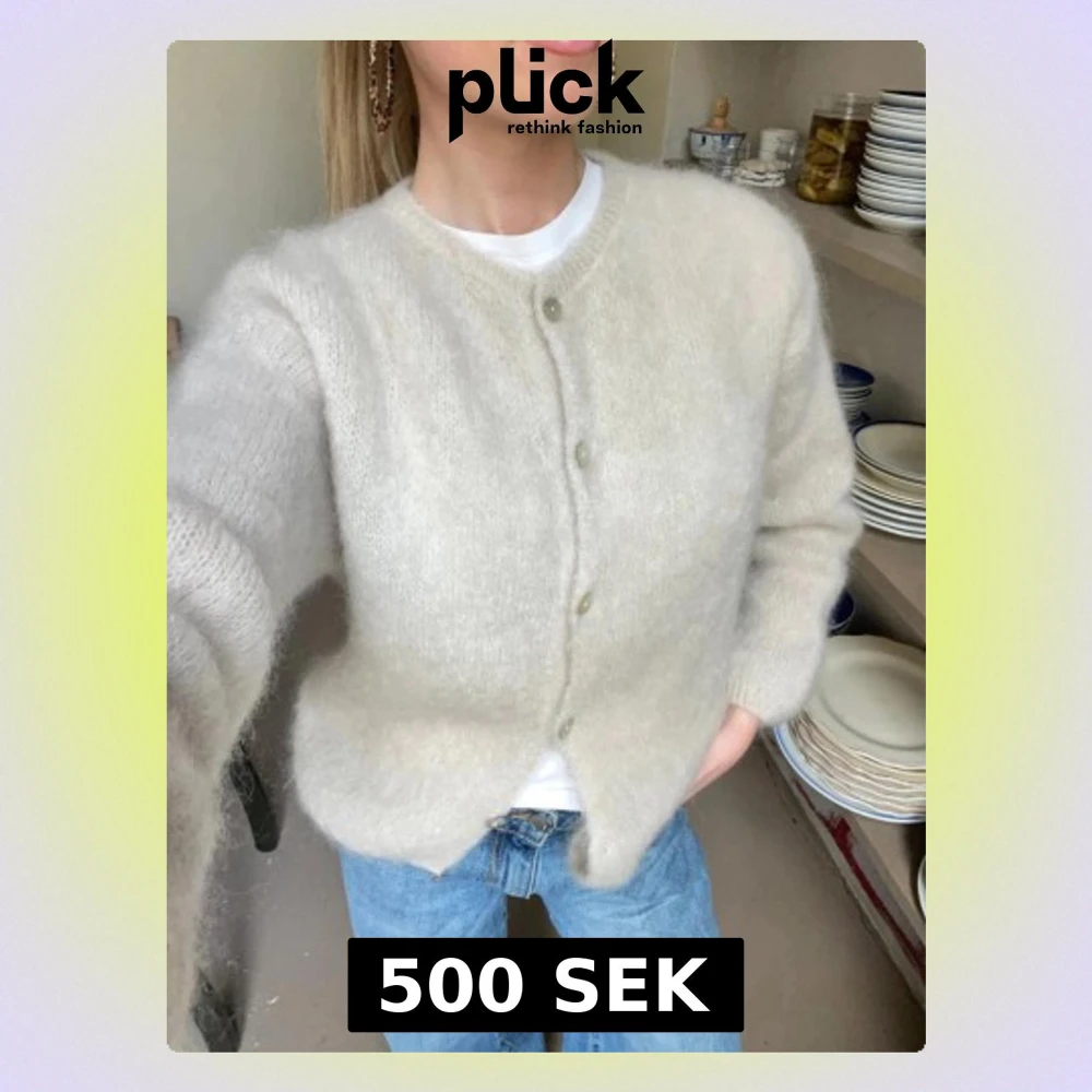 Mysig beige kofta med rund hals och knappar framtill. Koftan är fluffig och har en avslappnad passform med långa ärmar. Perfekt att slänga över en t-shirt eller linne för en chill look. Materialet känns som mohairmix och ger en lyxig känsla.