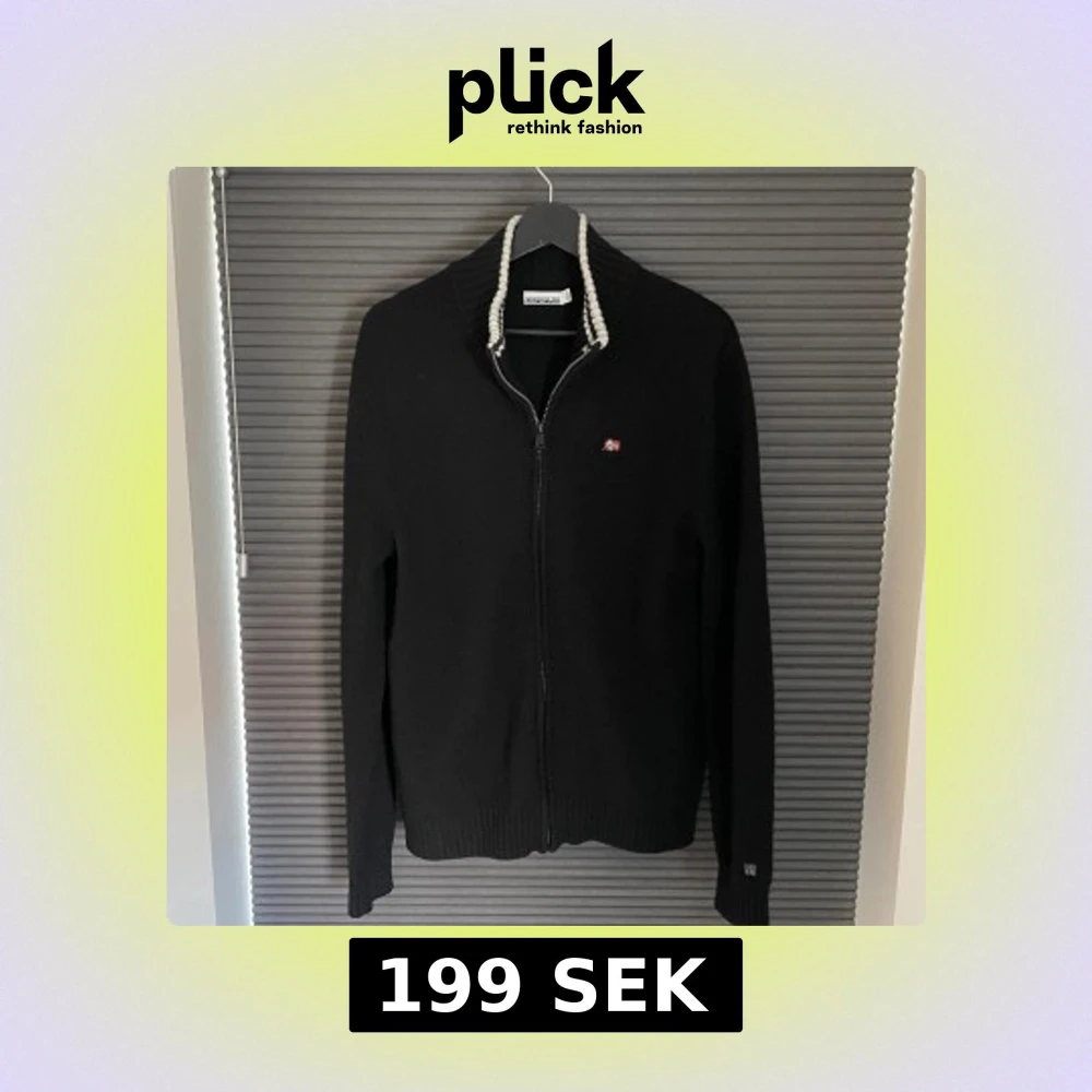 Svart stickad kofta från Napapijri med dragkedja framtill och ribbad krage med grå och vita detaljer. Liten broderad norsk flagga på bröstet. Storlek L
