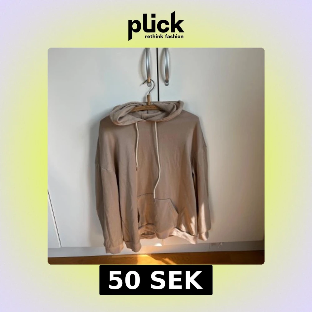 Säljer en oversized beige hoodie med stor huva och dragsnören. På ryggen finns ett stort tryck med en blå fjäril på ryggen . Storlek L/XL