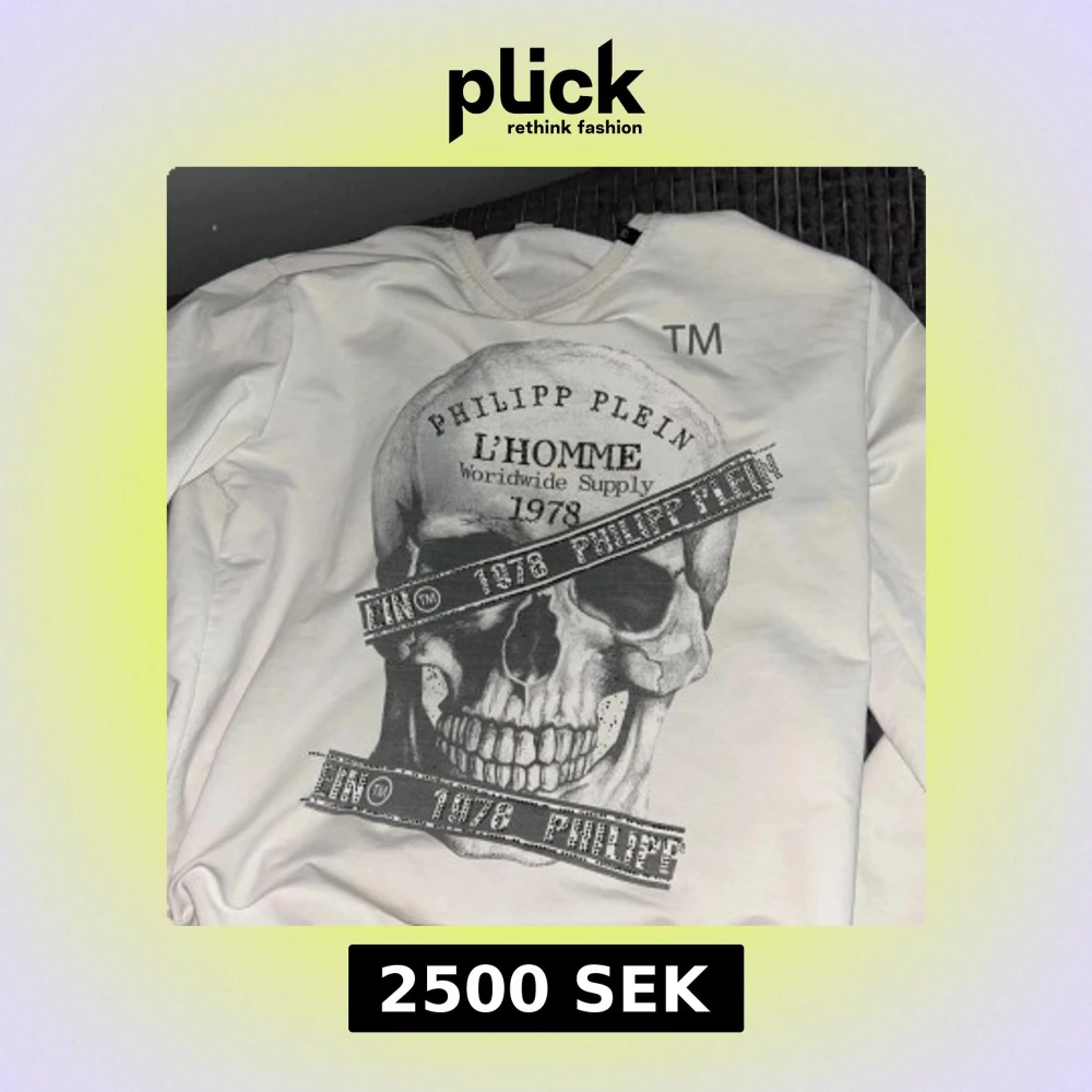 Säljer en vit långärmad tröja från Philipp Plein med stort tryck av en dödskalle och texten 'L'HOMME Worldwide Supply 1978' på framsidan. Tröjan har ribbade muddar och en cool streetstil.