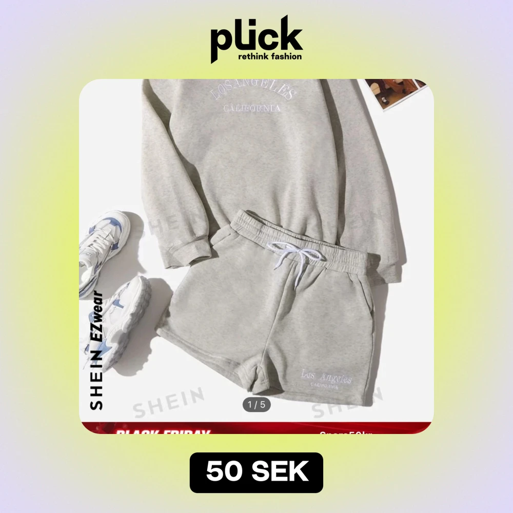 Mysig grå sweatshirt och matchande shorts från SHEIN. Tröjan har tryck med texten 'Los Angeles California' och långa ärmar. Perfekt för en avslappnad dag eller en chill kväll med vänner. Shorts med bekväm resår i midjan och snörning. Perfekt set för en casual look!