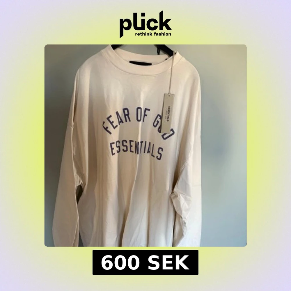 Säljer en beige långärmad tröja från Fear of God Essentials med tryck i mörkblått på bröstet. Tröjan har en loose passform och är tillverkad i mjuk bomull. Perfekt för dig som gillar streetwear och oversized stil.