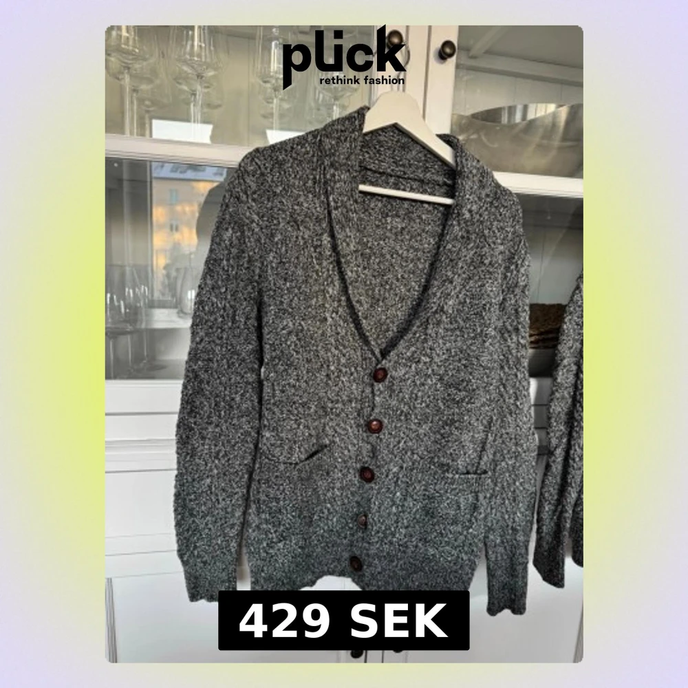 Mysig gråmelerad kofta med sjalkrage och fem bruna knappar framtill. Koftan har två fickor och är stickad i ett mjukt material. Perfekt för lager på lager och chill dagar.