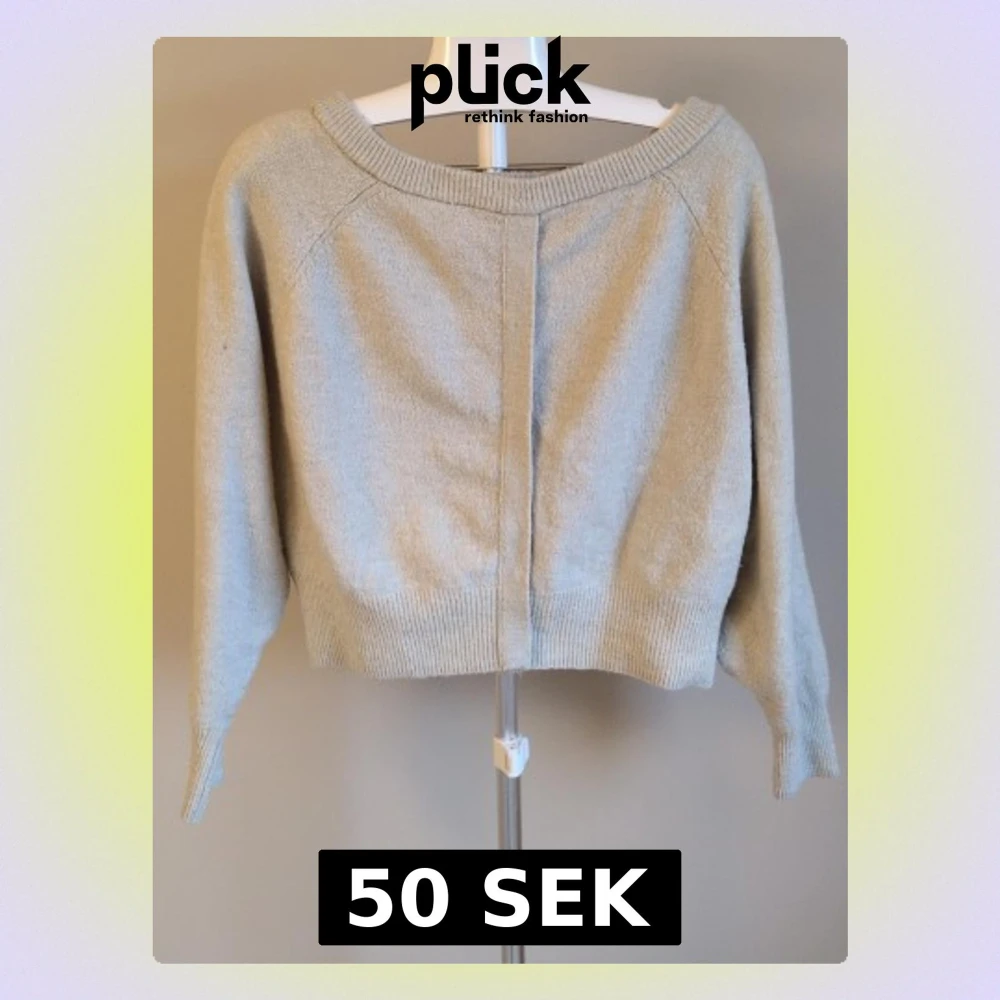 Säljer en beige croppad stickad tröja med bred halsringning och långa ärmar. Tröjan har ribbade muddar vid ärmslut och nederkant samt en dekorativ söm framtill. Perfekt för lager på lager och enkel att styla.