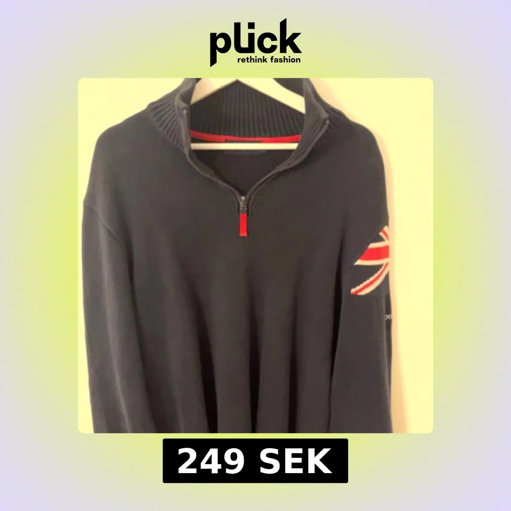 Snygg svart tröja med dragkedja och ribbad krage. Har en cool flaggdetalj på ärmen i rött och vitt. Perfekt för en stilren och avslappnad look.