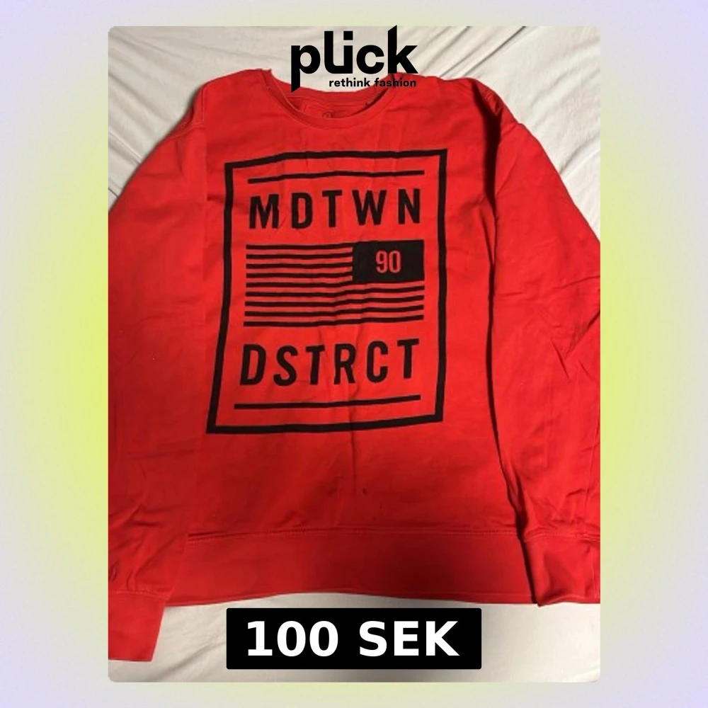 Cool röd sweatshirt från FSBN i storlek L med stort svart grafiskt tryck på framsidan där det står 'MDTWN DSTRCT 90'. Tröjan har rund hals och långa ärmar, tillverkad i mjuk bomull. Perfekt för dig som gillar streetwear och snygga prints.