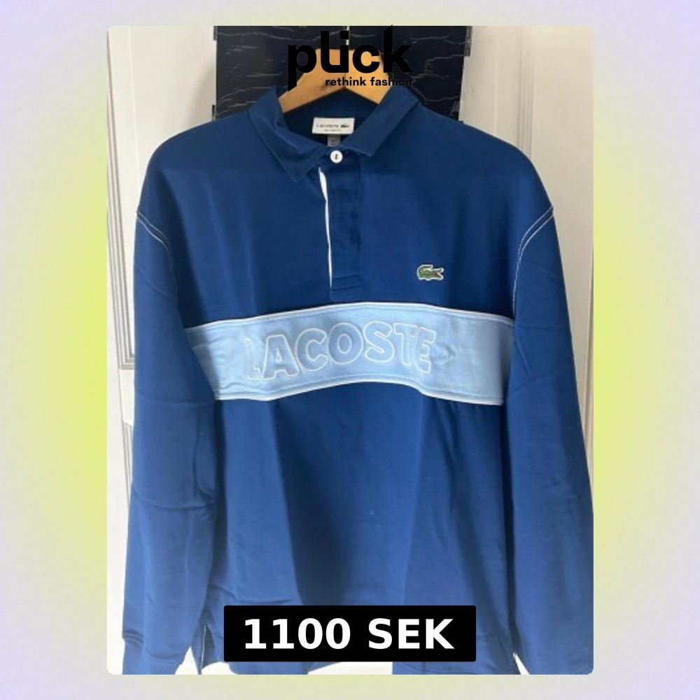 Snygg blå pikétröja från Lacoste med vit knapp och klassisk krage. Tröjan har ett brett ljusblått band över bröstet med stor broderad Lacoste-logga och den ikoniska krokodilen på vänster sida. Långärmad och tillverkad i mjuk bomull.
