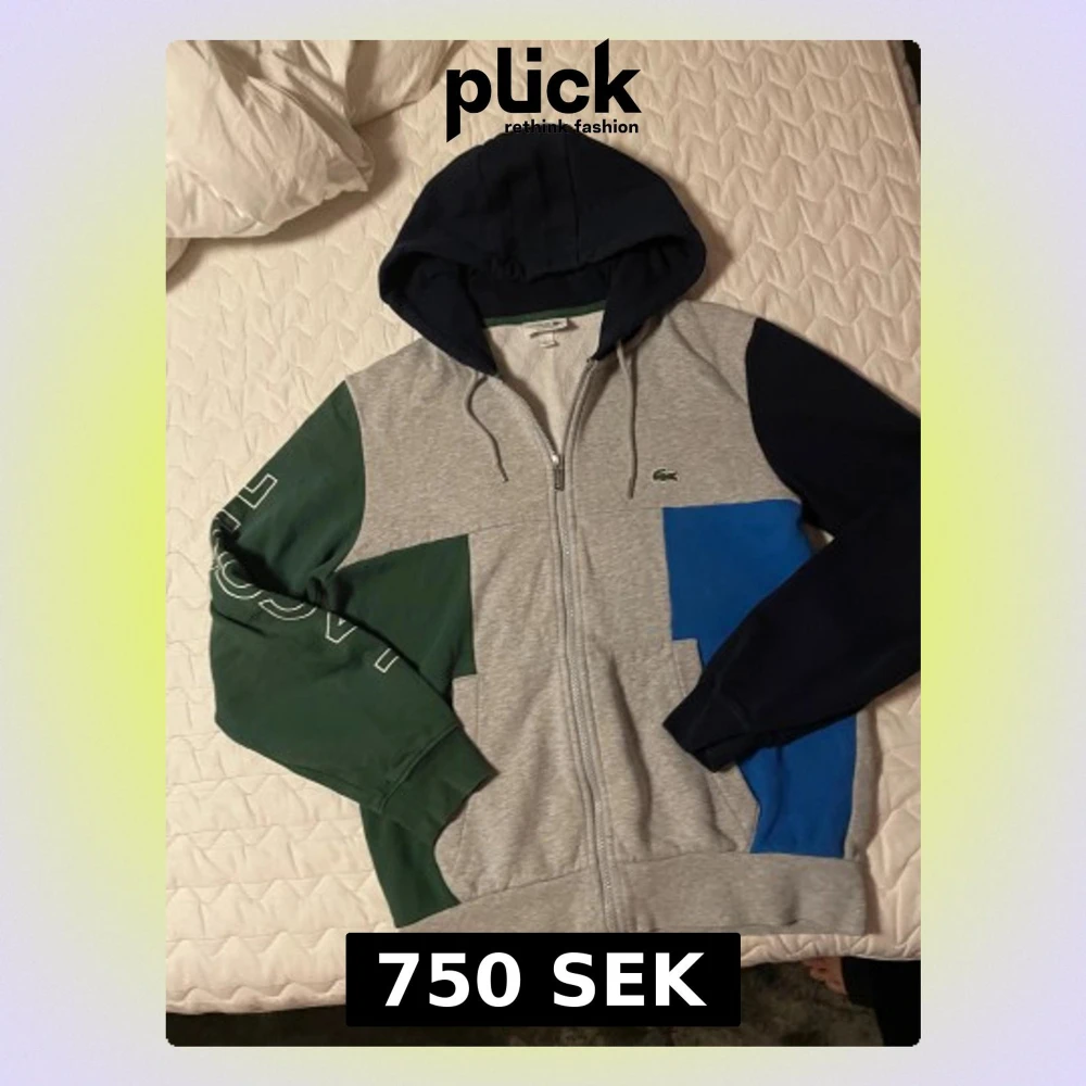Säljer en snygg hoodie från Lacoste i storlek S. Tröjan har färgblock i grått, grönt, blått och mörkblått, med dragkedja framtill och snörning i huvan. Klassisk Lacoste-logga på bröstet och tryck på ena ärmen. Perfekt för dig som gillar streetwear.