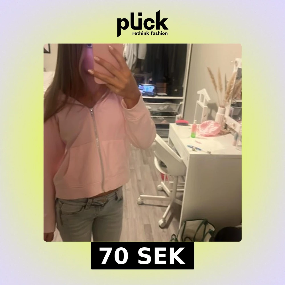 Säljer en ljusrosa hoodie med dragkedja och huva. Tröjan har en croppad passform och stora fickor framtill. Perfekt för dig som gillar en chill och söt stil. Materialet känns mjukt och skönt mot huden.